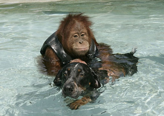 据英国媒体5月14日报道,在美国南卡罗来纳州,7岁的猩猩Suryla和3岁的布鲁泰克猎犬Roscoe是最好的朋友。它们在美特尔海滩的T.I.G.E.R.S庇护所里总是一起吃东西、游泳,甚至共骑一头27岁的非洲象。15日,他们将在一起在美国著名的电视节目奥普拉脱口秀上出镜。