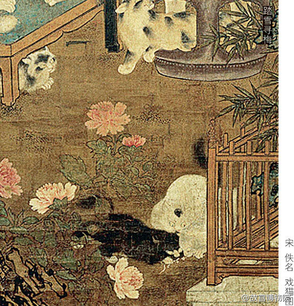 #古画中的名猫#《相猫经》中说:“‘乌云盖雪’,必身背黑,而肚腿蹄爪皆白者,方是。若仅止四蹄白者,名‘踏雪寻梅’。其纯黄白爪者同。”《富贵花狸图》中的猫是属于“乌云盖雪”。“踏雪寻梅”又名“雪里钻”,《戏猫图》里位于画面右下方的就属于“踏雪寻梅”。(《故宫画谱•花鸟卷•猫狗》)